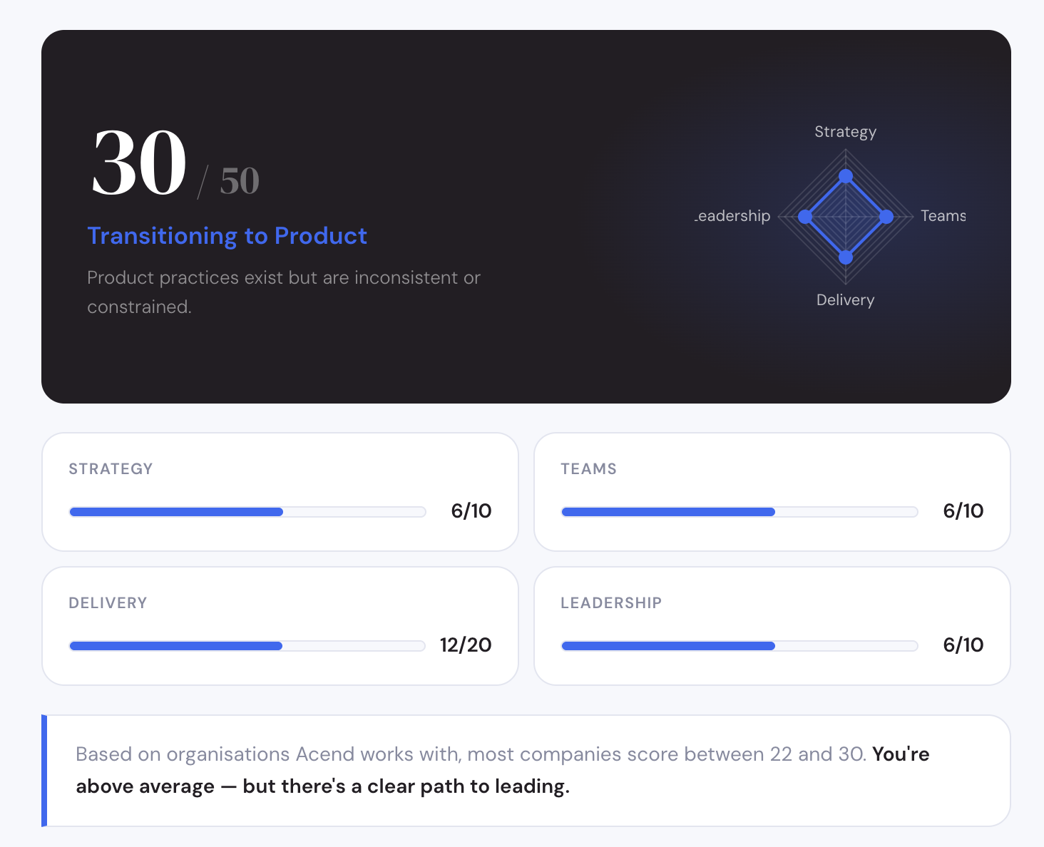 Rate 10 statements to get an instant maturity score, dimension breakdown, and personalised recommendations.
